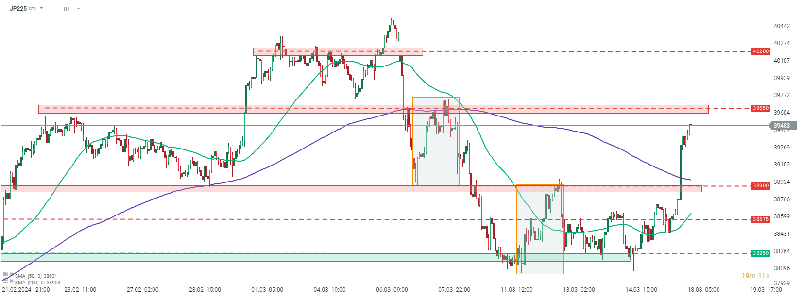 A Nikkei (JP225) 2%-ot emelkedett ma, a gyengébb jen támogatásával. Az index áttörte a piaci geometria felső határát a 38,900 pontos területen, és 2024. március 8. óta a legmagasabb szintre emelkedett. Forrás: xStation5