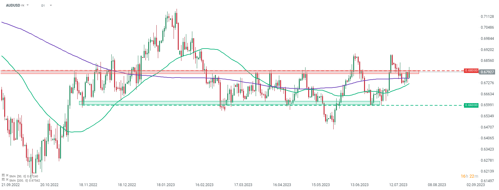 Az AUDUSD ma magasabb szinten kereskedik, köszönhetően a FOMC utáni amerikai dollár gyengülésének. A pár megpróbál visszamászni a 0,6800-as ellenállási zóna fölé. Forrás: xStation5
