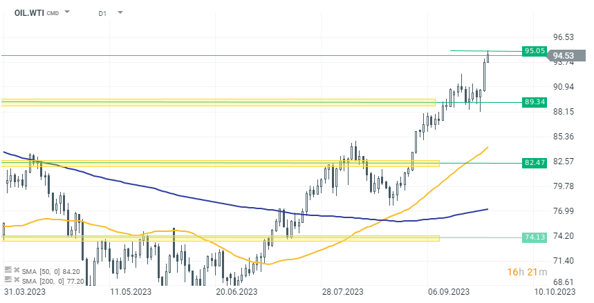 Az olaj ára ma is folytatja felfelé irányuló mozgását. A nap első felében a kőolaj hordónkénti ára egy időre elérte a 95 dollárt, és jelenleg kissé alatta, 94,50 dolláron tartja magát. Forrás: xStation 5