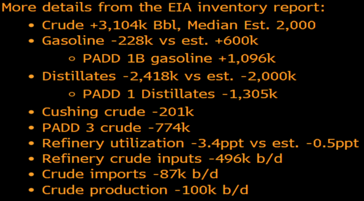Az olajkészletek 3,104 millió hordóval növekedtek, miközben a piac 2 millióra számított. A benzinkészletek 228 ezerrel, a desztillátumok pedig 2,418 millió hordóval csökkentek. Összességben a készletek támogatják az olajárak csökkenését. A brent nyersolaj (OIL) teszteli az 58 USD / hordó árfolyamszintet