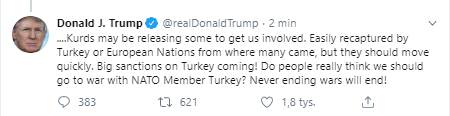 Donald Trump megismételte, hogy a Törökországgal szembeni szankciók jönnek. Forrás: Twitter.