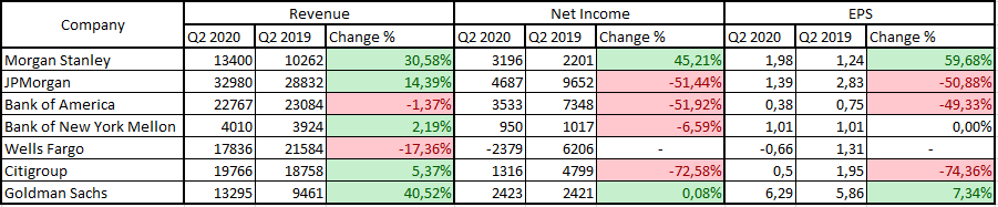 Almost every big US bank booked lower profits in Q2 2020 compared to Q2 2019. Situation was caused by much lower interest rates that have bitten into the net interest margin of banks and made their traditional banking operations much less profitable. However, some banks still managed to report revenue higher than in Q2 2019. There is a clear pattern in this case - banks with significant trading operations managed to offset revenue drop from traditional banking services. Goldman Sachs is an outstander here - superb trading performance not only allowed the bank to report higher revenue but also to book higher profits than in Q2 2019!