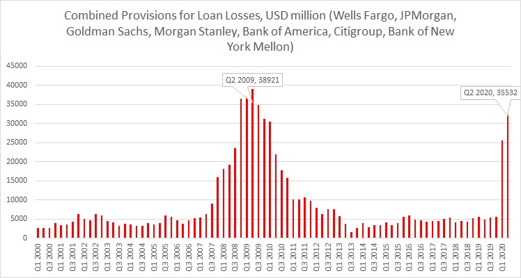 Results of big US banks may not look that bad but one should keep in mind that Fed helped Wall Street as well. Opening of debt markets, aimed at avoiding credit squeeze similar to the one from the Global Financial Crisis (GFC), turned out to be very profitable for investment bankers who served companies seeking for funds. Nevertheless, Q2 2020 was another quarter that saw banks set aside massive amounts for credit loss provisions. On the chart below one can see how current provisions compare to those from GFC.