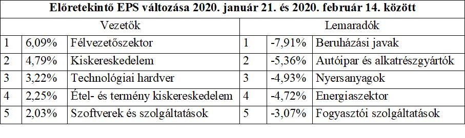 A koronavírus igazolt indok lehet a várakozások csökkentésére az árupiachoz kapcsolódó, az autóipari és a termelési javakhoz kapcsolódó részvények esetében. Míg a beszállítói láncok működésének akadozása negatívan érintheti a technológiai részvényeket, a nagyobb cégek eredményvárakozásai és az erős Q4-es eredményszámok miatt az elemzők felfelé módosították becsléseiket a teljes szektorra vonatkozóan.