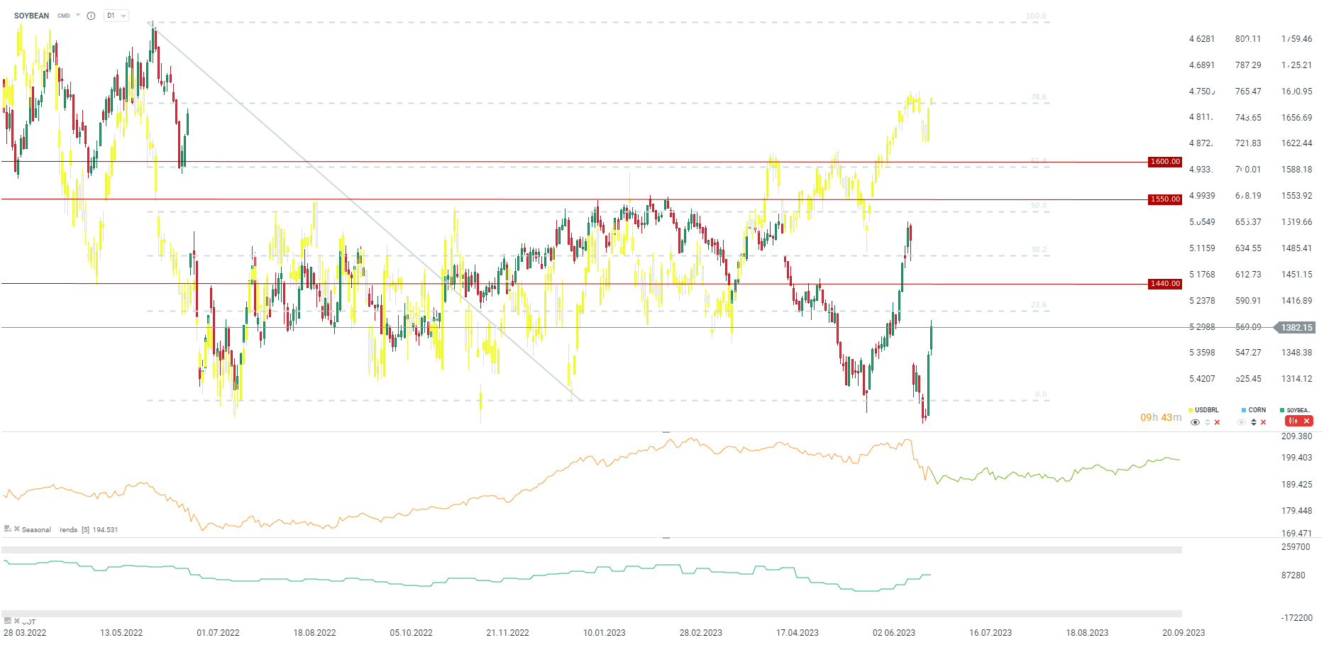 Soybean experienced steep gains following small post-rollover declines. The rollover itself resulted in a 10% price drop on SOYBEAN market. Price managed to recover around half of the drop triggered by rollover. Key resistance level can be found around 1400 cents per bushel and the 23.6% Fibonacci retracement level of the downward move that took place over the summer last year. Seasonality indicates relatively flat performance of soybean in the weeks ahead, although there is potential for growth in the second half of August. Stronger Brazilian real also increases the competitiveness of US soybeans, which may lead to an attempt to close the rollover gap.