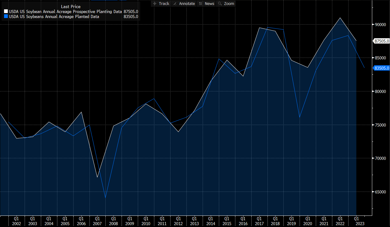 Comparison between planned plantings (white line) and final plantings (blue line). Source: Bloomberg