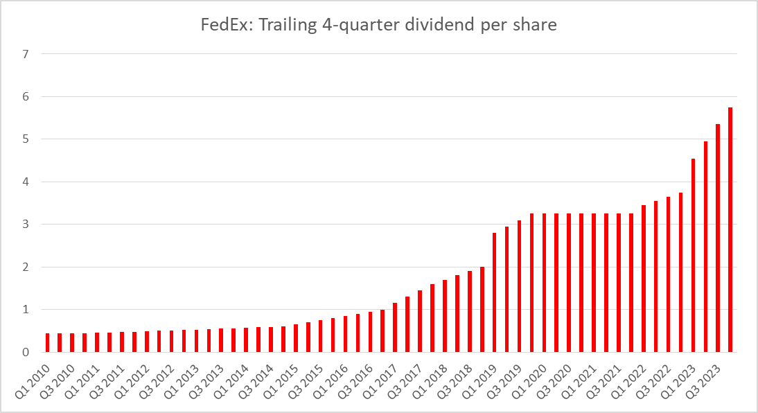 While FedEx is not expecting to grow its business as fast as it did during the post-pandemic boom, it still plans to continue to increase capital distributions at a rather quick pace. Company said that it plans to purchase $2.0 billion during fiscal-2024, a 25% increase from $1.5 billion spent on share repurchases in fiscal-2023. A $1.5 billion in fiscal-2023 buybacks led to repurchases of over 9 million shares, reducing the number of shares outstanding by 4% and creating upward pressure on EPS. Company also plans a 10% dividend increase in the fiscal year.