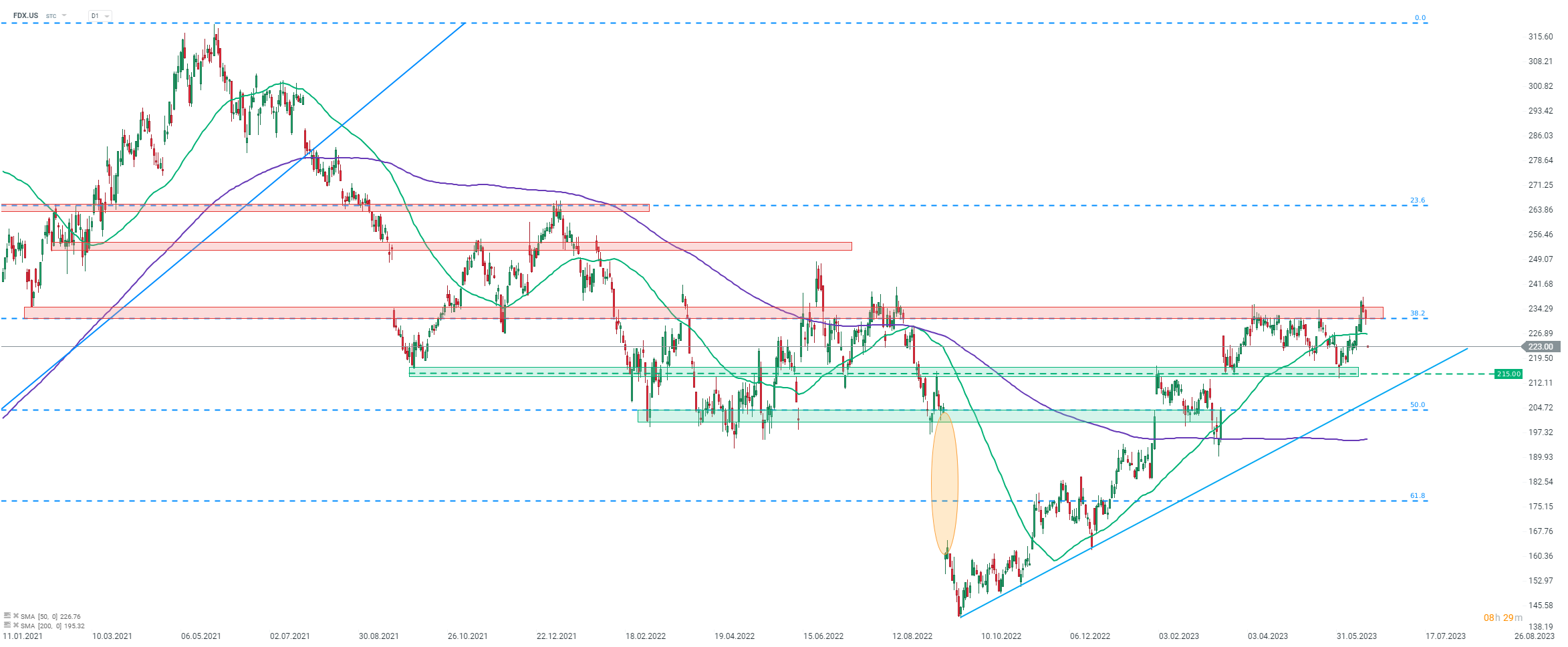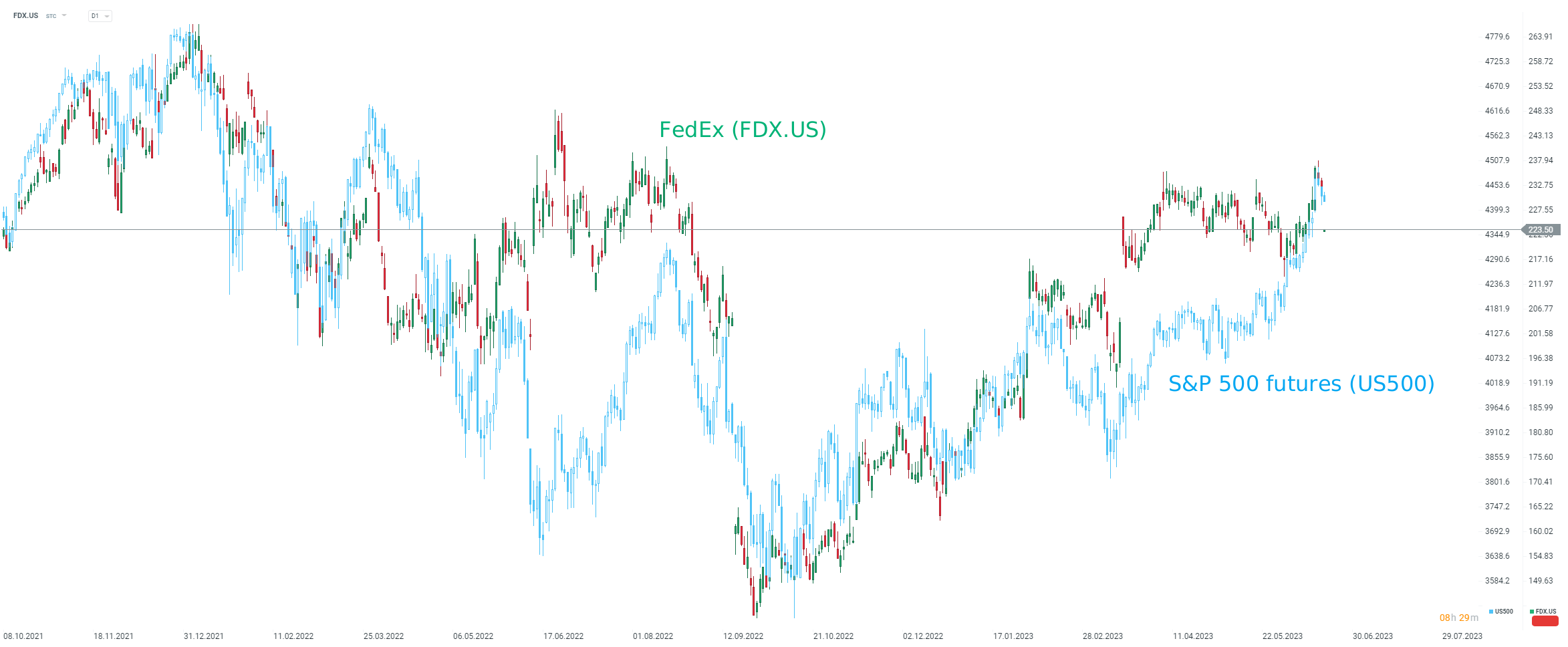FedEx is considered to be one of the bellwethers for the US economy and a significant correlation can be spotted between its share price (FDX.US) and S&P 500 futures (US500, blue overlay). Source: xStation5