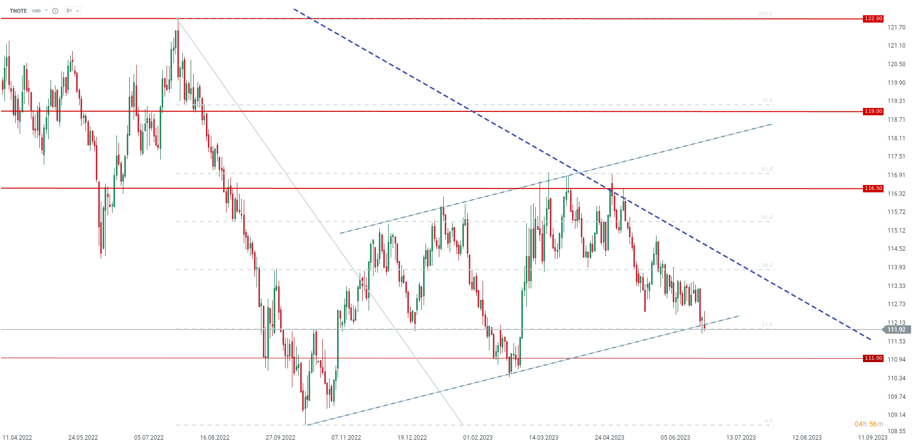 The yield curve in the US is experiencing increasing inversion. Today, a new local low was reached, slightly below -110 basis points. This is a result of the rising yields of 2-year Treasury bonds, while we also observe an increase in the yields of 10-year Treasury bonds. However, the increases in 2-year yields are significantly stronger. When considering the spread between the 10-year and 2-year yields along with interest rates in the US, we can observe pressure for further rate hikes to continue.