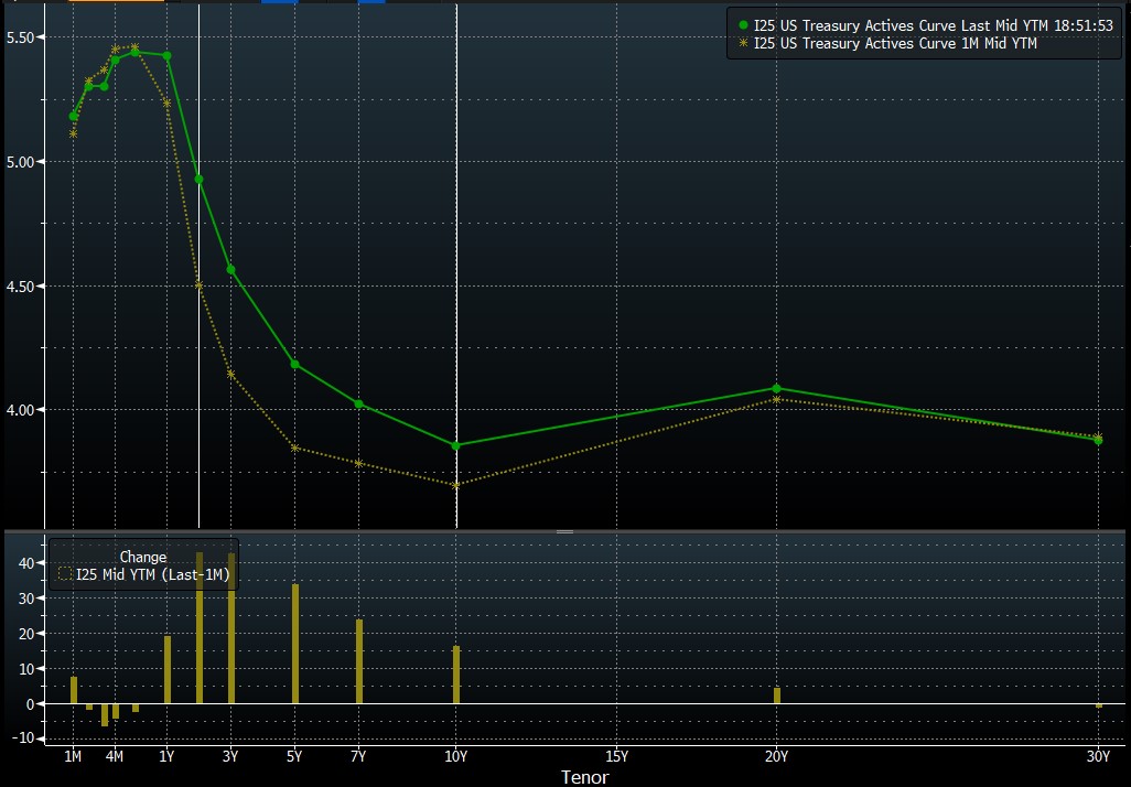 A month ago, the yield curve was noticeably flatter, although it was still far from reaching positive levels. Despite significant movements in TNOTE (10-year bond prices), as seen on the chart above, it is evident that the magnitude of the movement was not as large as in the case of 2-year yields (which saw a monthly increase of 40 basis points). Source: Bloomberg.