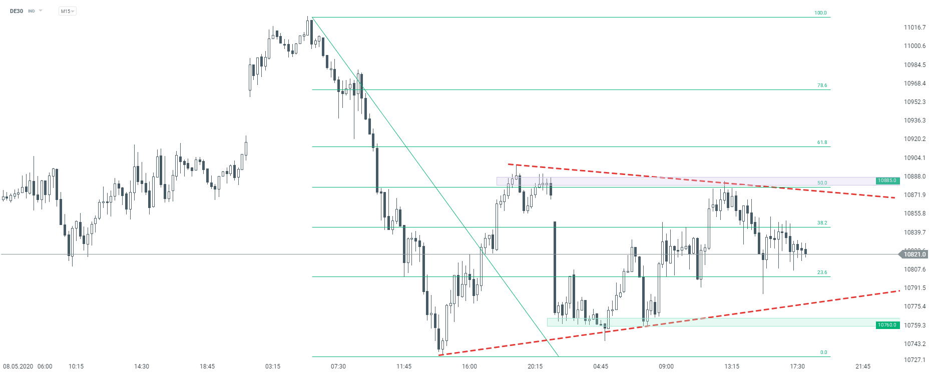The German index is trading in an sideways move today. In case buyers manage to break higher the resistance at 10885, another upward impulse could be launched. On the other hand , breaking below support at 10760, may trigger a bigger downward move. There are no key news today, so one have to wait for the breakout later this week.