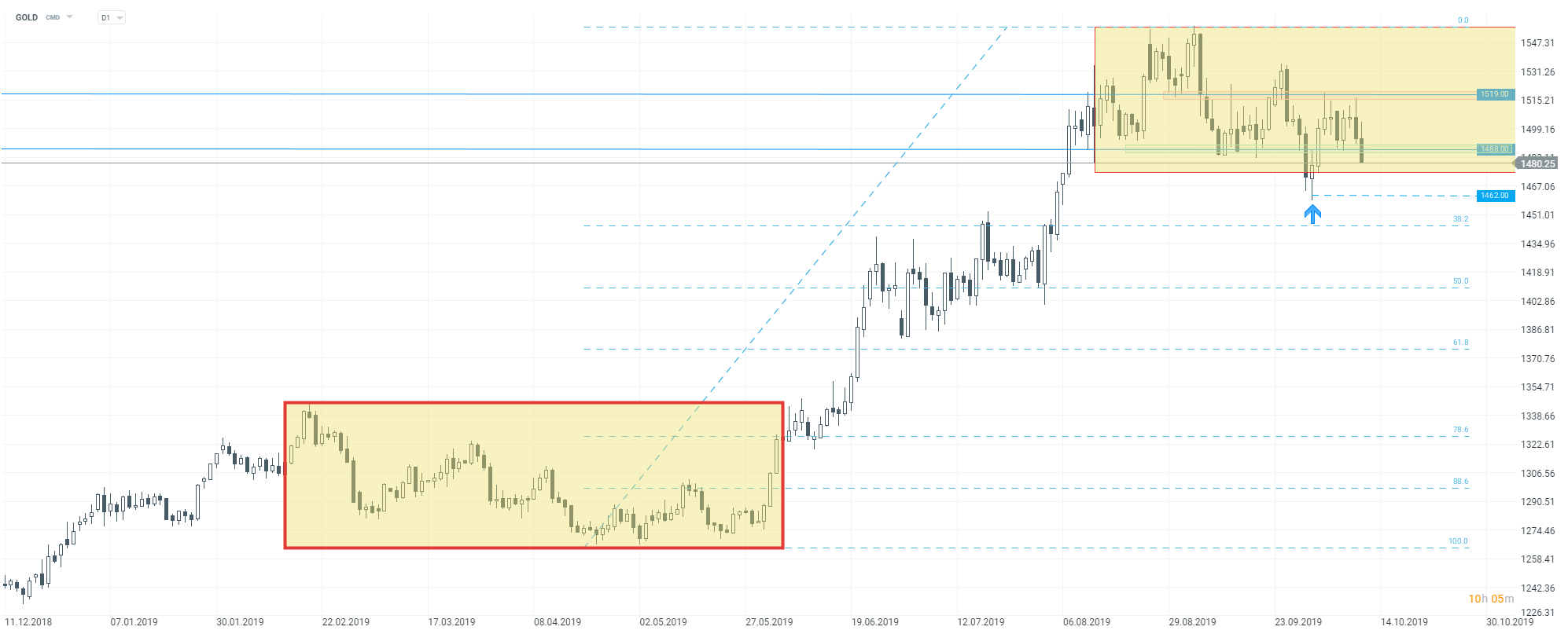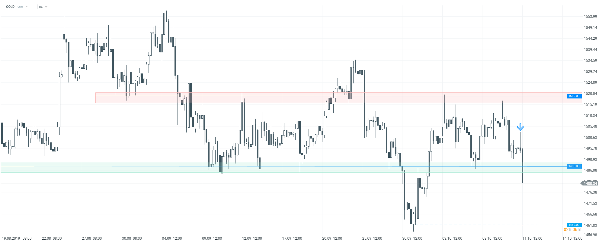 Az arany árfolyama az elmúlt napokban egy konszolidációs zónában helyezkedett el. A kereskedelmi tárgyalások pozitív hírei azonban a befektetőket a tőke kockázatosabb eszközökbe történő áthelyezéséhez vezetik. Másrészről az arany árfolyama csökken. Az ár a támasz szint alá esett vissza, 1488 dollárra, előkészítve az utat a nagyobb visszaeséshez. Az eladók most a 1462 dollár körüli közelmúltbeli mélypontra koncentrálhatnak.