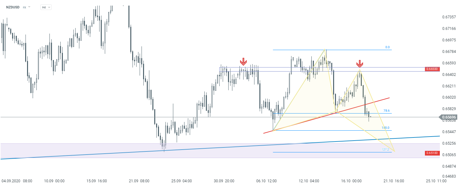 Looking at the lower time frame - H4, one can see that a breakout of the local trend line occurred recently, which is also the neck line of the smaller head and shoulders formation, which suggests a continuation of declines. The baseline scenario is therefore a move towards the previously mentioned support at 0.6510. This area is important not only in terms of classical technical analysis, but also in terms of harmonics analysis. Point D of the potential harmonic Butterfly pattern is located in this area, therefore bulls may try to defended this level.