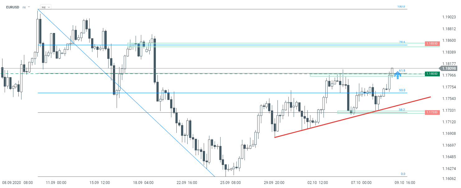Az amerikai dollár a hét végére eladási nyomás alá került. Az EURUSD chartot technikai szemmel nézve azt láthatjuk, hogy a pár az ellenállás fölé tört 1,18 USD-nél. Ha a vásárlóknak sikerül az árat e felett tartaniuk, akkor felfelé irányuló mozgás következhet 1.1855 irányába. Másrészt, ha az ár lejjebb törne, akkor a lefelé irányuló elmozdulás mélyülhet a helyi trendvonal (piros vonal) felé.