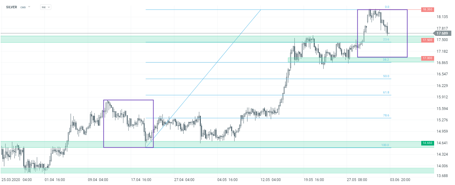 The silver market had a problem with breaking above the $18.35 handle, and the downward correction started. Looking at the H4 interval, the precious metal is trading in the vicinity of recent highs which should act as a support. Failure to stop downward move there would pave the way towards the $17.00 handle, where the lower limit of Overbalance structure is located. Nevertheless, one should keep in mind that the long-term trend on silver remains upward.