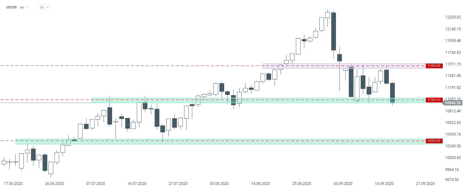 Az amerikai részvénypiacokon az amerikai nyitás után erőteljes csökkenés tapasztalható. Az US100-ot a napos idősíkon tekintve láthatjuk, hogy az index elérte a legfontosabb támasz szintjét. Ha az eladóknak sikerül a napos gyertyát a kerek 11 000 pontos fogantyú alatt zárni, az nagyobb lefelé irányuló korrekcióhoz vezethet. Ilyen esetekben a legközelebbi támasz a 10 335 szinten található. Másrészt, ha a vevők sikerrel járnak a csökkenés megállításával, a felfelé irányuló mozgás elindulhat egészen a 11.550 pont felé.