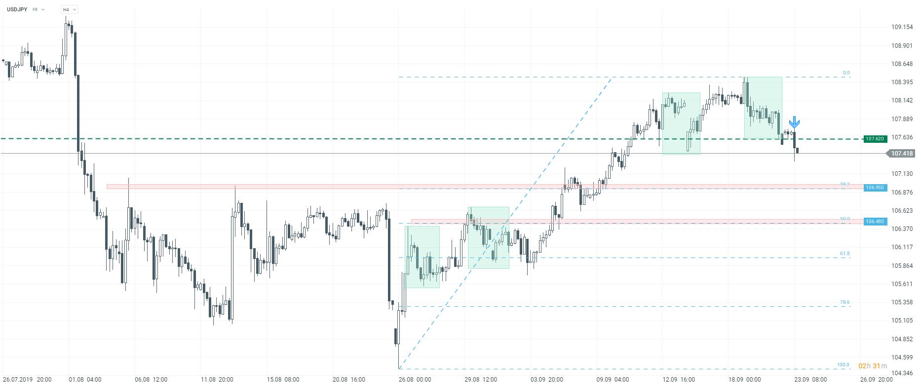 Az eladási jel, amelyet a Overbalance módszertan határoz meg, megjelenik az USDJPY chartján. Ár az 1:1-es szerkezet alsó korlátja alá esett, ami nagyobb korrekciót eredményezett. A korábban átlépett 107.62 kapaszkodó most ellenállásként funkcionálhat, míg a legközelebbi támasz a 106,95 közelében található. Ennek ellenére a korrekció potenciális tartománya körülbelül 50 pip. A lefelé mutató forgatókönyv érvénytelenné válik, ha az ár a 107,63-as kapaszkodó fölé visszakapaszkodik.