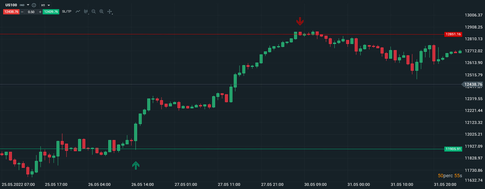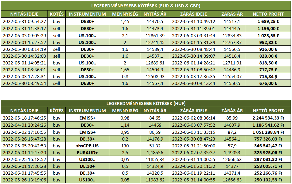 A legnagyobb realizált veszteség a múlt héten 26 457,43 EUR (10 309 317,63 forint) volt. Kereskedőnk befektetését 4 nap után zárta US100 instrumentumon. A kötés mennyisége 1,5 lot volt. Eladási (sell) pozícióját befektetőnk 2022. május 26-án a 11905,91 szinten vette fel, majd veszteséggel zárta a 12851,16 árszinten 2022. május 30.-án.