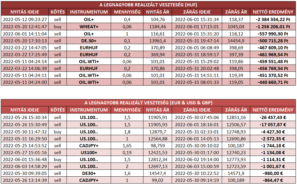 Az érmének két oldala van ezért megmutatjuk a legnagyobb realizált veszteségeket is, melyek ügyfeleinket érték kereskedésük során.