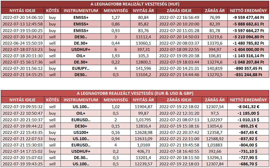 Az érmének két oldala van ezért megmutatjuk a legnagyobb realizált veszteségeket is, melyek ügyfeleinket érték kereskedésük során.