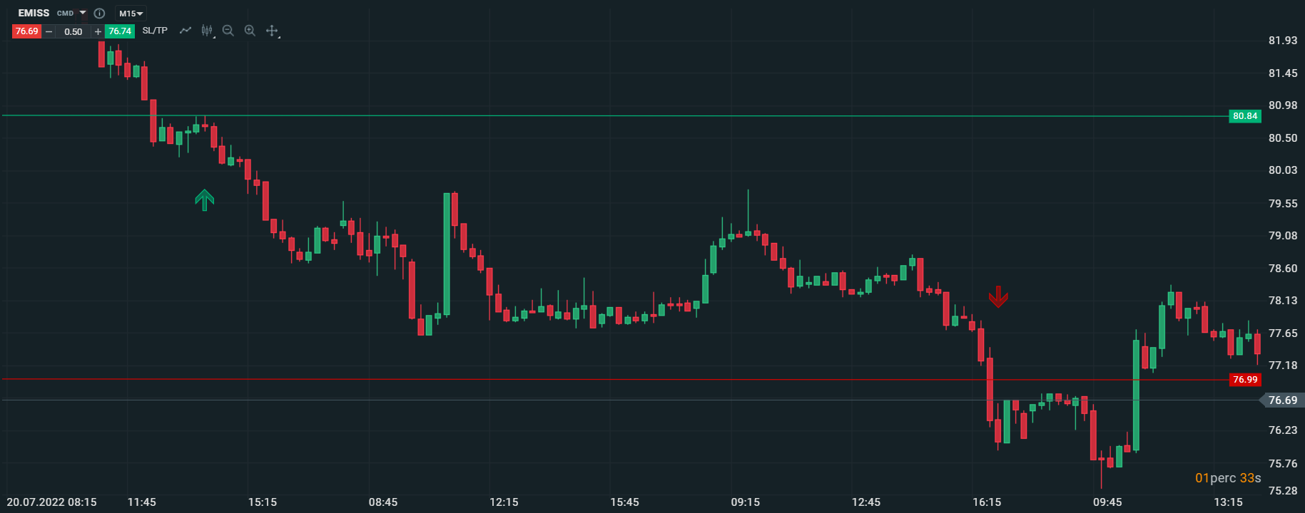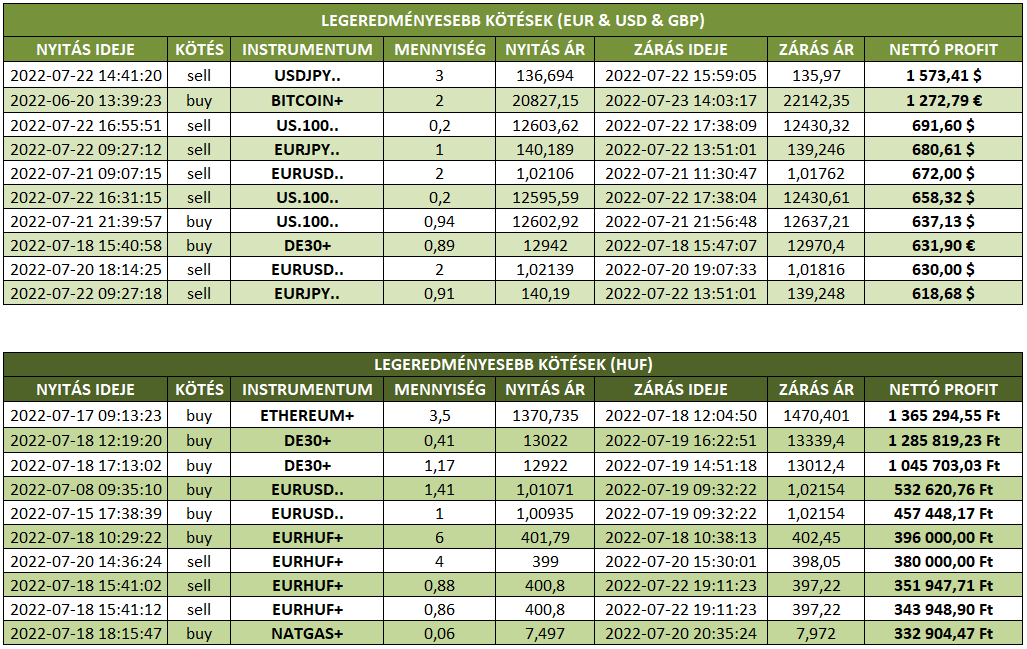 A legnagyobb realizált veszteség a múlt héten 9 559 477,44 forint (24 030,48 EUR) volt. Kereskedőnk befektetését 2 nap után zárta EMISS instrumentumon. A kötés mennyisége 1,27 lot volt. Vásárlási (buy) pozícióját befektetőnk 2022. július 20-án a 80,84 szinten vette fel, majd veszteséggel zárta a 76,99 árszinten 2022. július 22-én.