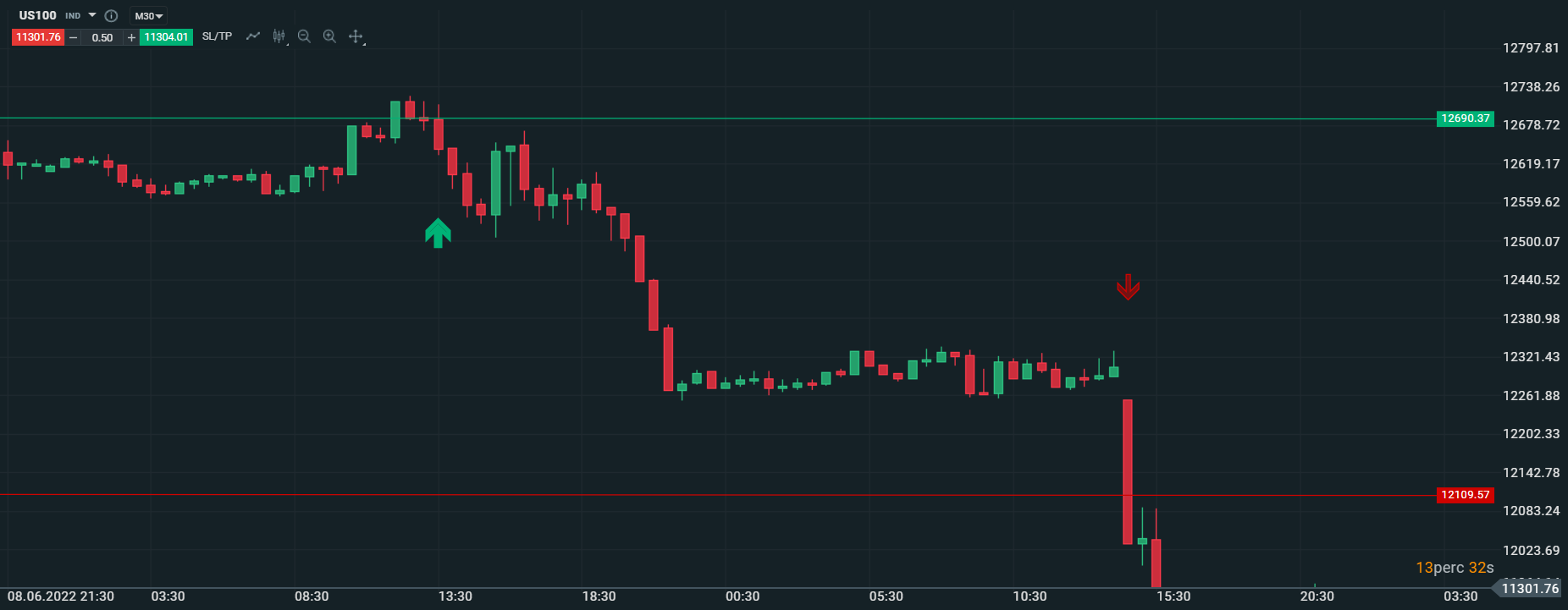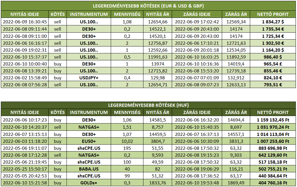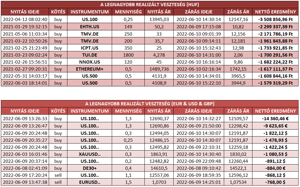 A legnagyobb realizált veszteség június második hetében 14 360,46 EUR (5 677 644,81 forint) volt. Kereskedőnk befektetését 1 nap után zárta US100 instrumentumon. A kötés mennyisége 1,3 lot volt. Vásárlási (buy) pozícióját befektetőnk 2022. június 9-én a 12690,37 szinten vette fel, majd veszteséggel zárta a 12109,57 árszinten 2022. június 10-én.