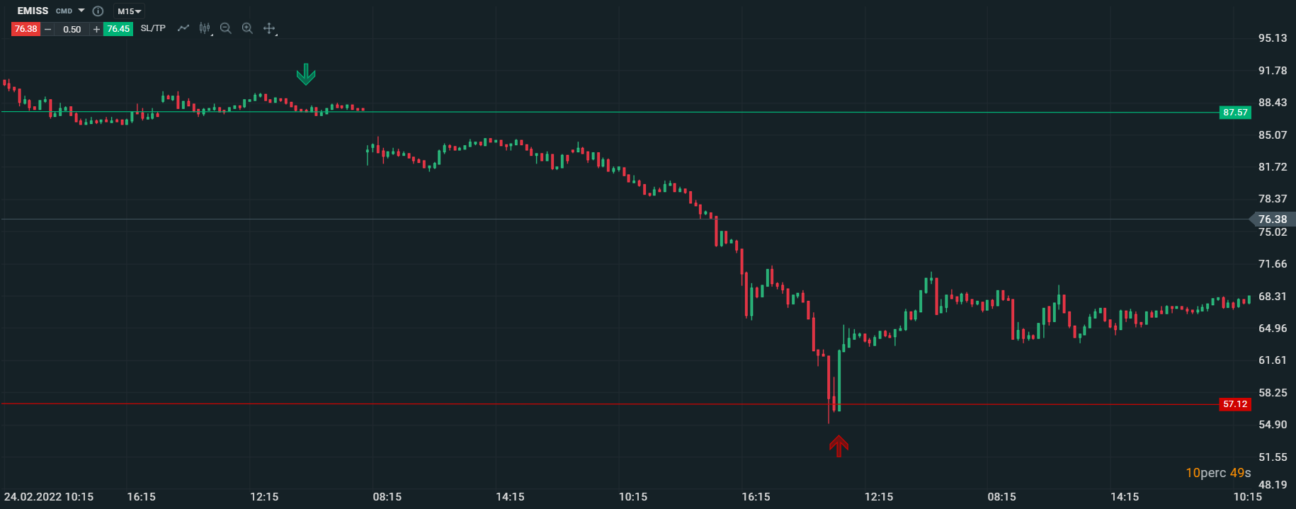 A felsorolt tényezők mellett a kereskedőnk úgy döntött, hogy nem állít be SL szintet, ami végeredménye egy óriási veszteség lett. A hétvégi eseményeknek „köszönhetően” az EMISS árréssel nyitott lejjebb, mint ahol a kereskedőnk pozícióba szállt. Ezek után ugyanúgy elhanyagolta a kockázatkezelés és SL szintek beállítását, amit az követett, hogy az EMISS a 87.57 szintről egészen 57,12 szintig szakadt le.