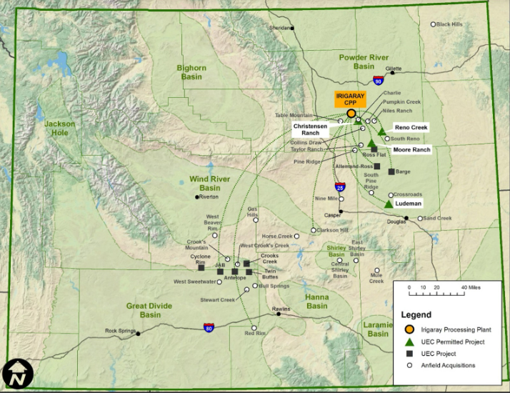 Map of Uranium Energy Corp's projects in Wyoming. The center is the operating Irigaray plant. Source: UEC