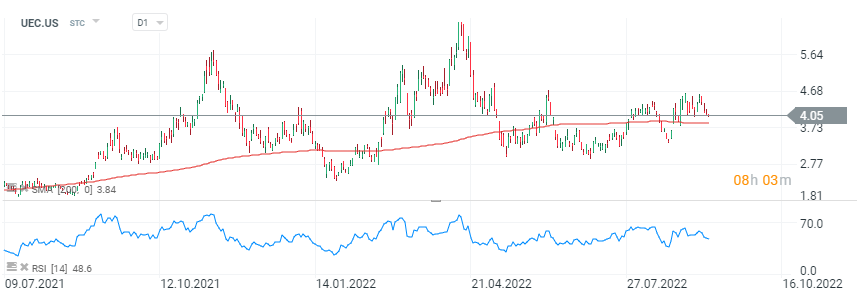 Uranium Energy Corp (UEC.US) chart, D1 interval. The company's stock is still above its 200-session moving average, and the RSI may herald a slow recovery in demand. Although the bulls have been rejected twice from support at $4.70 a renewed attack of these areas seems possible in the context of the global energy crisis and the more favorable narrative around nuclear power recently. Source: xStation5