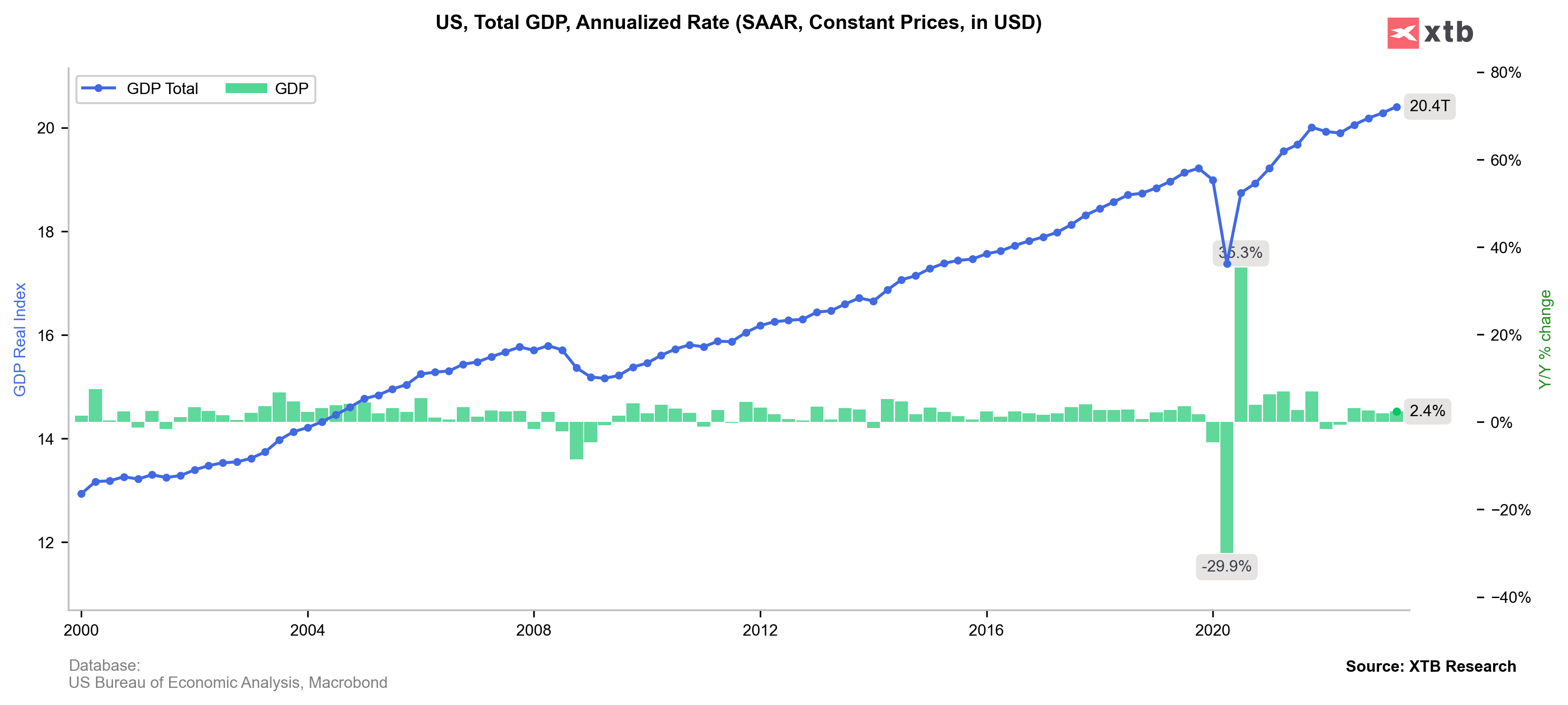 On the other hand, however, if inflation shows satisfactory progress, the Federal Reserve chief conveyed that policy will become less restrictive, which supported expectations for rate cuts in 2024. On the performance side of the equation, euphoria was seen in Meta Platforms (META.US) shares - the company beat earnings per share and revenue forecasts, and also showed a significant increase in active users in apps and an improving ad market. The catalysts it can use in the coming quarters are mainly the development of AI language models, the release of Meta Quest 3 in the fall (VR) and Twitter's competing platform Threads.