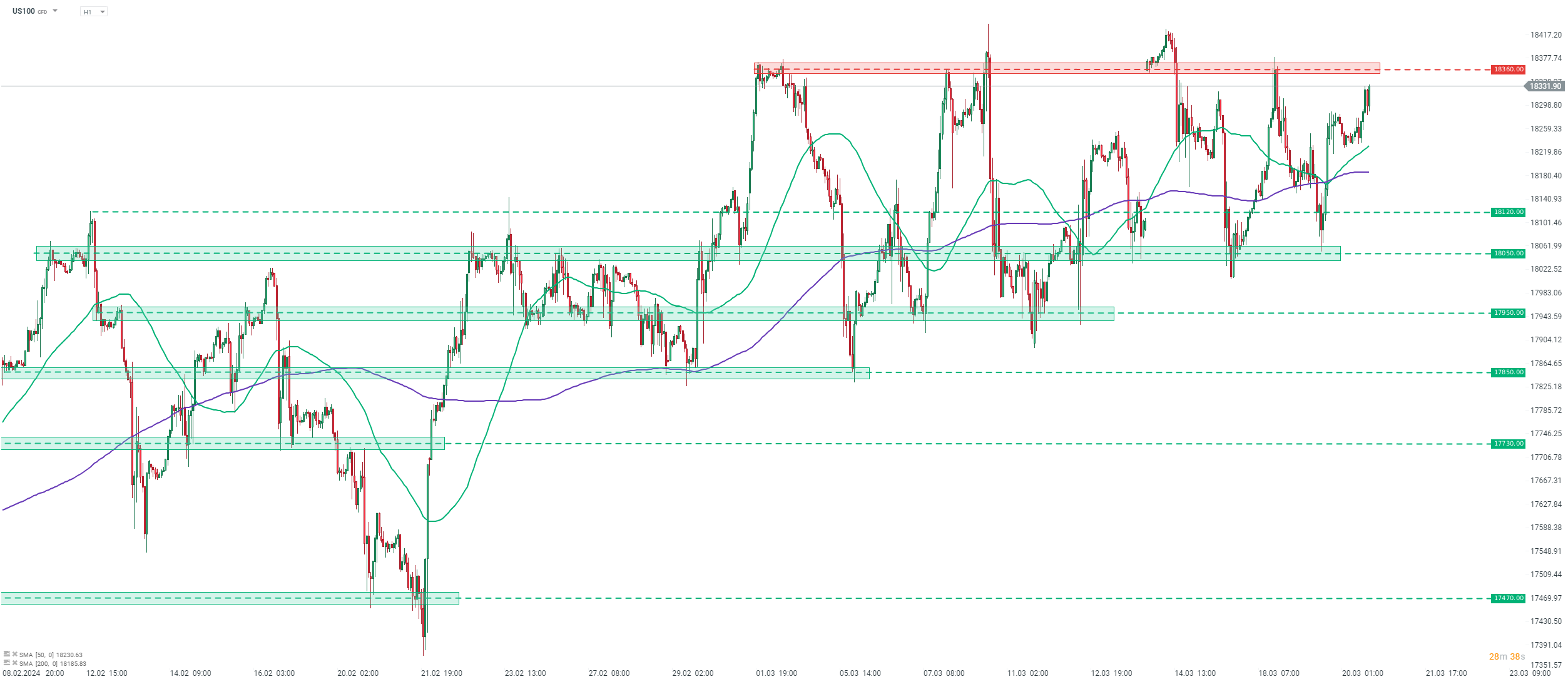 - Az US100 a 18,360 pontos ellenállási zóna közelében kereskedik