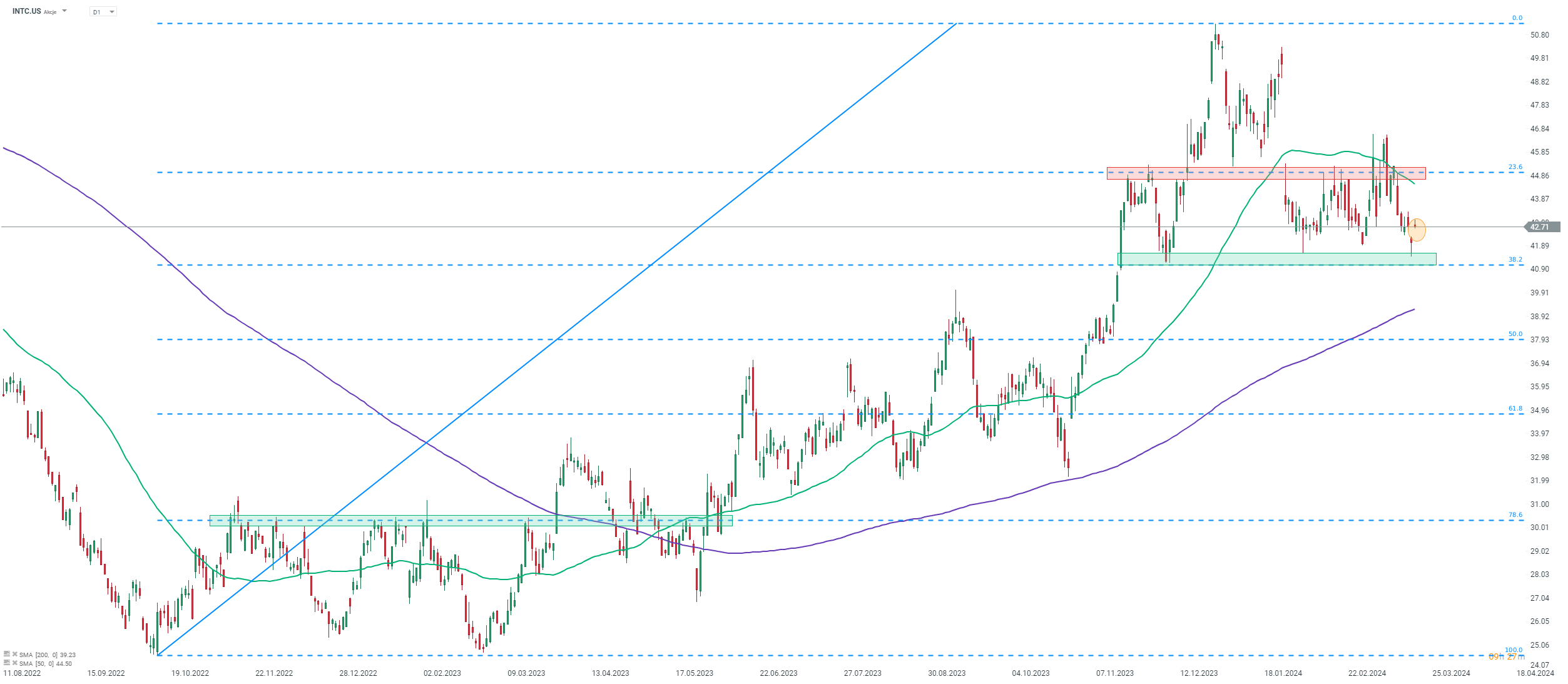 Az Intel részvényei (INTC.US) a mai kereskedést magasabban kezdték, amit a nagy amerikai támogatásokról szóló hírek is támogattak. A részvény a 38,2%-os retracementtel jelölt támaszzónáról pattant le, amely a kereskedési sáv alsó határaként szolgált. A tartomány felső határa a 45,00 dolláros tartományban, amelyet a 23,6%-os retracement jelöl, egy kulcsfontosságú közeli ellenállás, amelyet figyelni kell. Forrás: xStation5