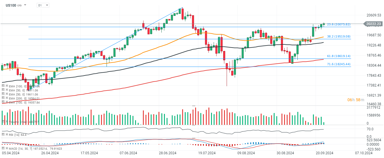 A Nasdaq 100 (US100) határidős ügyletek megvédték az EMA200 (piros vonal) fő támasz zónáit, és most a 23,6 Fibo felett, a 20.000 pontnál lévő 23,6 Fibo felett folytatják az emelkedést, „magasabb mélypontokkal”, ami további technikai alapokat ad a további emelkedéshez. A fő ellenállási zóna a 21 000 pontnál, a 2024. júliusi ATH közelében található. Fontos támasz a 19.500 pontos szint, ahol a 2024 áprilisában kezdődött emelkedő trend 38,2 Fibo értéke látható.