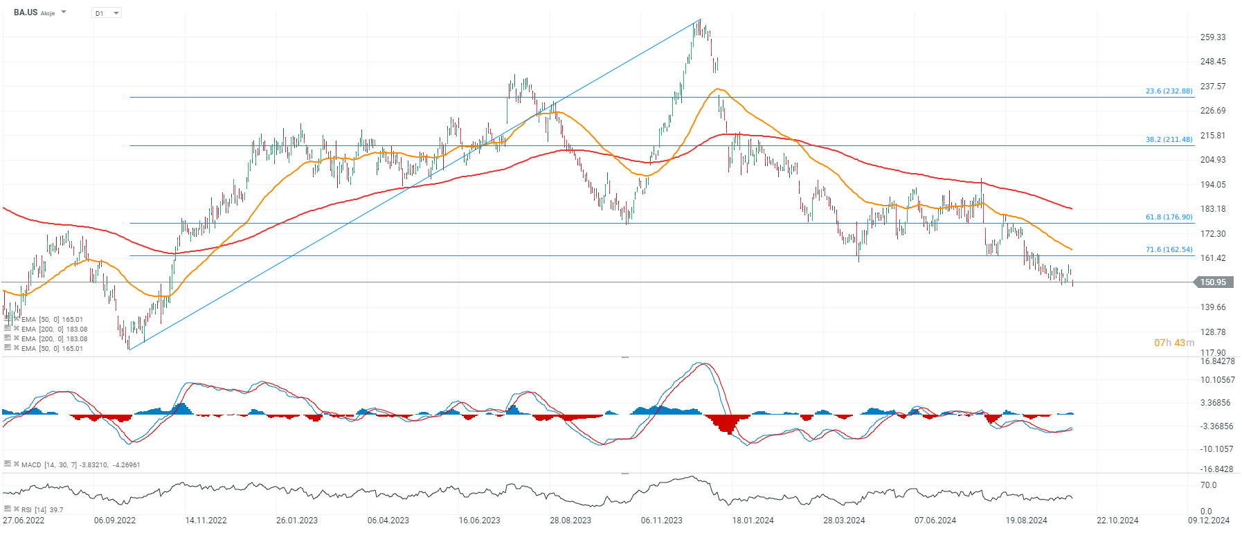 A Boeing ma 2022 októbere óta nem látott szinteket tesztel, 150 dolláron részvényenként, lemaradva az erős hangulatot a védelmi ágazatban és az amerikai védelmi vállalkozók szélesebb körében. Az olyan ügynökségek, mint az S&P „ócskavas minősítésre” történő leminősítése növelheti a vállalat jövőbeli finanszírozási kiadásait, miközben a Boeinget most egy hatalmas, több mint 58 milliárd dolláros adóssághalom sújtja, amelyből 4 milliárd dollárnyi adósság 2025-ben, és további 8 milliárd dollárnyi 2026-ban esedékes. A múlt hónapban a Fitch is arról tájékoztatott, hogy a megemelkedett, magasabb költségek és az elhúzódó sztrájkok miatt növekszik a „junk” besorolás kockázata.