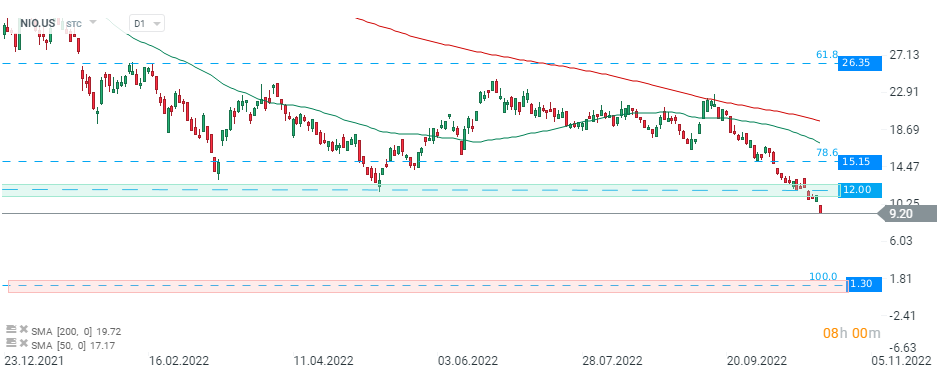 Nio (NIO.US) stock fell around 87.0% from its 2021 high. Stock launched today's session sharply lower and if current sentiment prevails, downward move may deepen towards $1.30 where 2019 lows are located. Source: xStation5