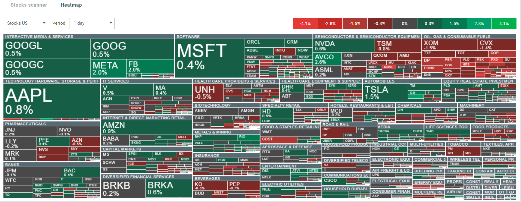 S&P 500 index stocks categorized by sectors and industries. Size represents market cap. Source: xStation5