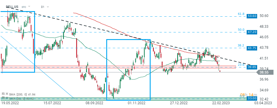 Dell Technologies (DELL.US) stock launched today's session lower below major resistance at $39.65, which is marked with previous price reactions and 23.6% Fibonacci retracement of the downward wave started in February 2022. As long as price sits below, downward move may deepen towards October 2022 lows at $33.00. Source: xStation5