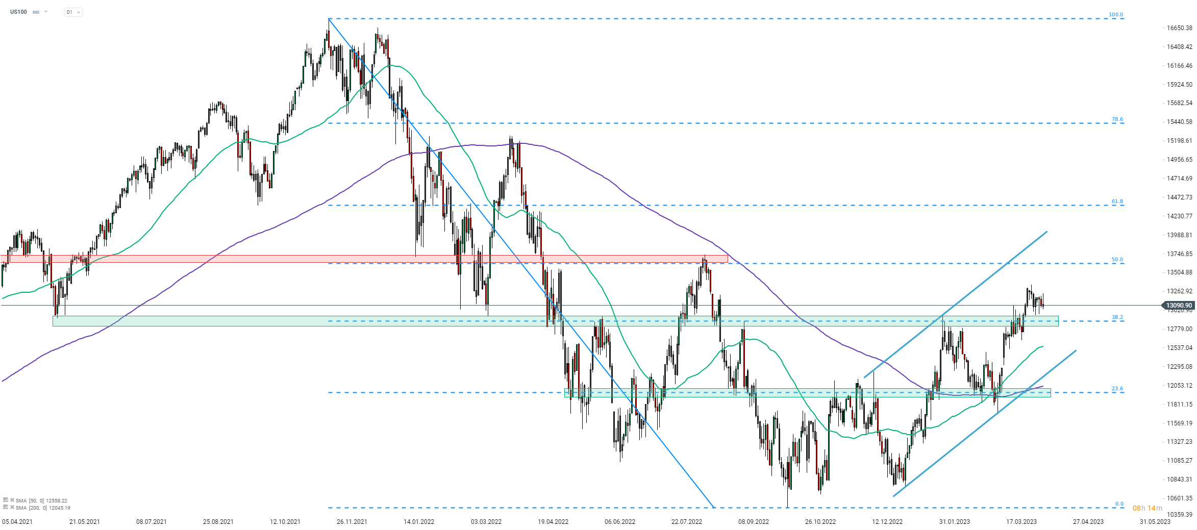 Wall Street caught a bid after dovish CPI print. Taking a look at Nasdaq-100 (US100) chart at D1 interval, we can see that the index tested a recently-broken price zone near 38.2% retracement, this time as a support, and bulls managed to defend it. However, much of the post-CPI gain was already erased. The index continues to trade within an upward channel and a positive price reaction to support retest suggests that upward move may be about to accelerate. In such a scenario, the first resistance zone to watch can be found ranging around 50% retracement in the 13,620 pts area.