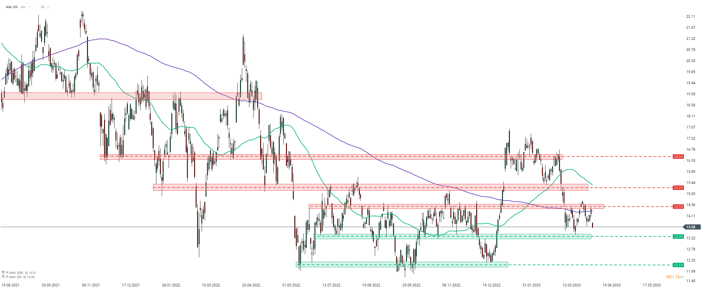 American Airlines (AAL.US) launched today's trading lower after the company warned that it is likely to miss Q1 earnings estimates. Stock is pulling back from the $14.50 resistance zone and unless bulls manage to regain control over the market, price may look towards a near-term support in the $13.30 area. Source: xStation5