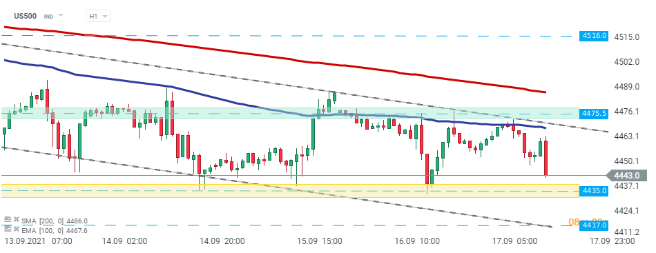 US500 - buyers again failed to break above the 4475.5 pts level which coincides with 100 EMA (purple line) and upper limit of the downward channel. As a result index pulled back towards support at 4435 pts. Should break lower occur, then, then next support at 4417 pts may be at risk. Source: xStation5