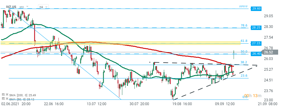 Invesco (IVZ.US) stock fell sharply yesterday, however sellers failed to break below the lower limit of the triangle pattern. Stock launched today’s session with a bullish price gap and broke above local resistance at $26.40 which coincides with previous price reactions and 50% Fibonacci retracement of the last downward wave. Next target for buyers is located at $27.15 and is marked with 61.8% Fibonacci retracement. Source: xStation5