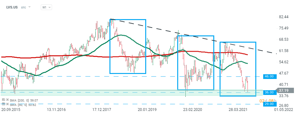 Las Vegas Sands (LVS.US) stock fell sharply this week and price is approaching major support at $36.00 which is marked by the lower limit of the 1:1 structure. Should break lower occur, then downward move may accelerate towards next support at $29.00. Source: xStation5