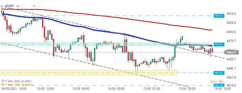 US500 finished yesterday’s session higher, however today buyers failed to uphold momentum and index pulled back below 4475.5 pts level which coincides with 100 EMA ( purple line) and is currently testing an earlier broken upper limit of the downward channel. If current sentiment prevails, then support at 4435.0 pts may be at risk. Source: xStation5