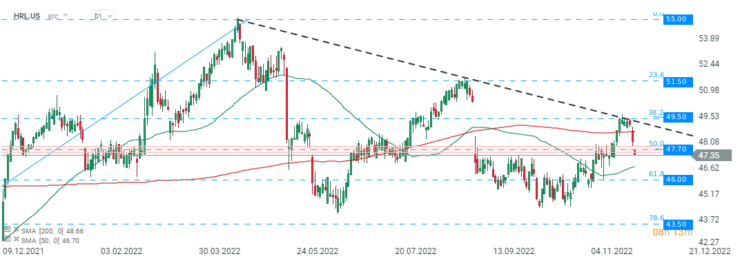 Hormel (HRL.US) stock launched an upward correction at the end of October, however bulls failed to break above major resistance at $49.50, which coincides with 38.2% Fibonacci retracement of the upward wave launched in September 2021 and downward trendline. Weak quarterly outlook provided more fuel for the bears and during today's session price broke below local support at $47.70. If current sentiment prevails, downward move may accelerate towards next support at $46.00. Source: xStation5