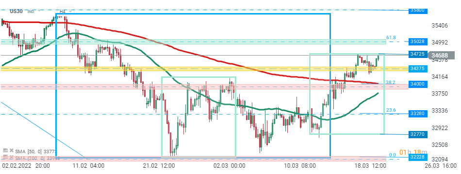 US30 managed to erase yesterday's losses and returned above 34375 pts level. Currently the index is approaching local resistance at 34725 pts, which is marked with an upper limit of the 1:1 structure. Source: xStation5