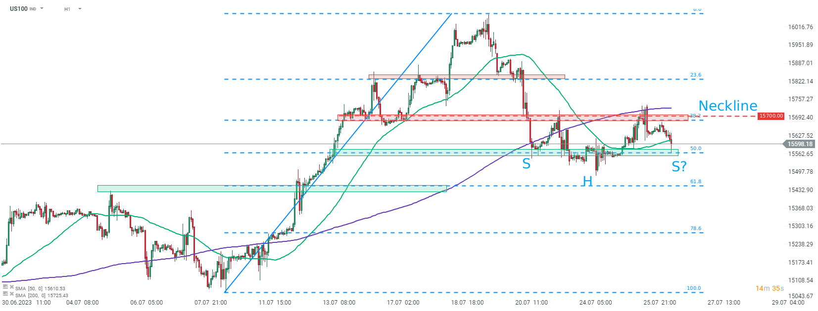 Ha megnézzük a Nasdaq-100 határidős ügyleteket (US100) a H1 intervallumban, láthatjuk, hogy az index érdekes technikai helyzetben kereskedik. Miután két sikertelen kísérletet tett a közelmúltbeli felfelé irányuló impulzus 38,2%-os retracementje fölé való visszatörésre, egy inverz fej-váll minta kezdett kialakulni a grafikonon. Az árfolyam a sajtó pillanatában az 50%-os retracementtel jelölt területet teszteli, és ha a bikáknak sikerülne megvédeniük, akkor a minta jobb oldala festődne meg. Egy ilyen forgatókönyv esetén a 15 700 pontos terület fölé való visszatörés jelezhetné, hogy egy nagy felfelé irányuló mozgás közeledik. Azonban egy dovish Fed-re lehet szükség ahhoz, hogy ez a forgatókönyv megvalósuljon.