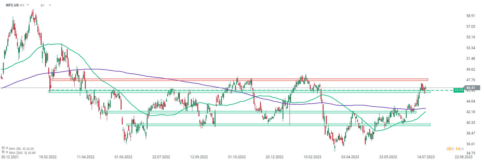 A Wells Fargo (WFC.US) magasabban indította a mai kereskedést, miután bejelentette visszavásárlási programját. A részvény a 46,00 dolláros támaszról pattant le, és egy ponton 3% körüli pluszban kereskedett. Az emelkedés egy részét azonban máris visszavette. Forrás: xStation5