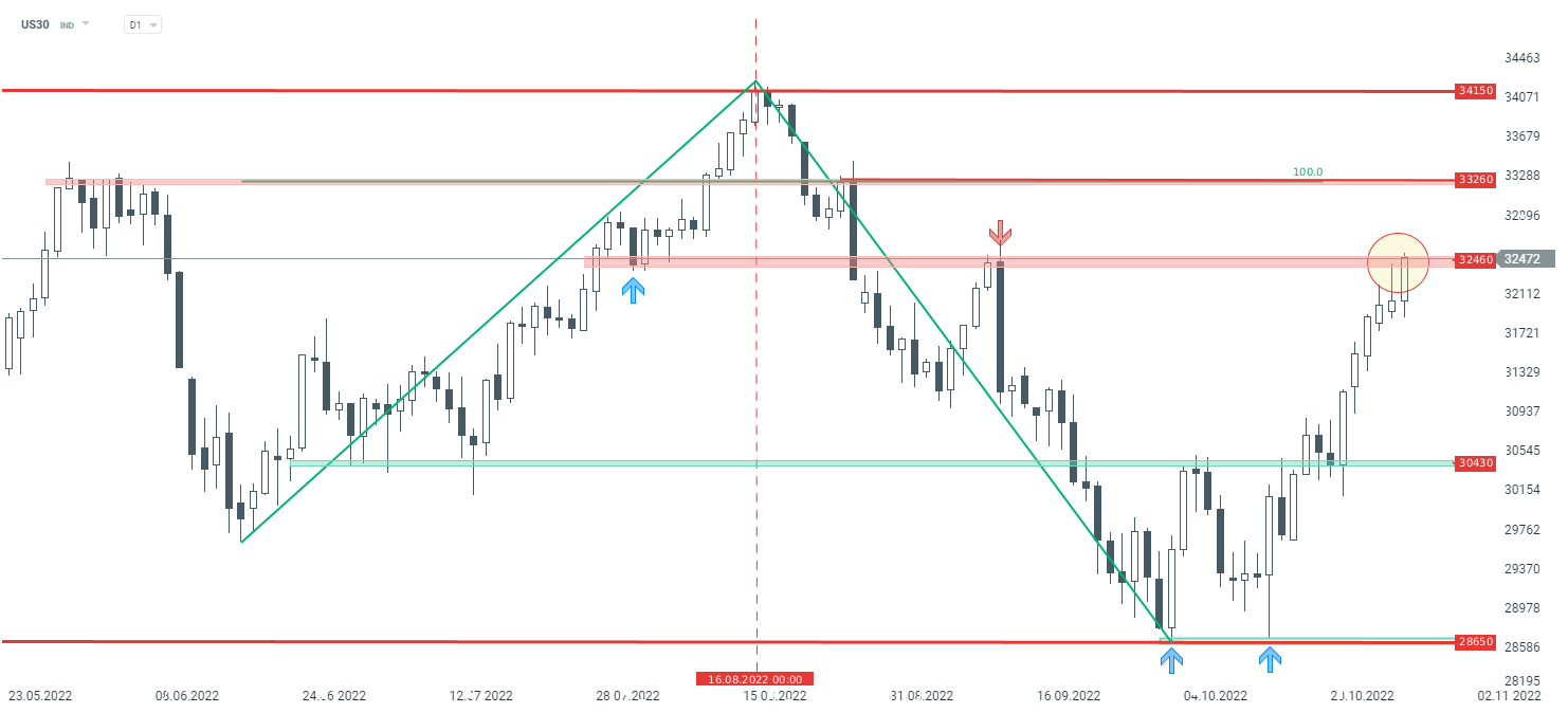 US30 rose sharply on Friday and broke above key resistance at 32460 pts, which is marked with previous price reactions. If current sentiment prevails, an upward move may accelerate towards the next resistance at 33260 pts. Source: xStation5