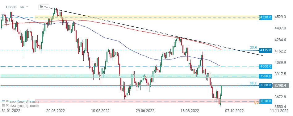 However one need to remember that JOLTS data is often very volatile and not always fully reflects the current macroeconomic situation. Nevertheless, investors euphorically reacted to the latest data, which led to strong upward moves of major benchmarks. US500 upholds yesterday's bullish momentum and is currently approaching key resistance at 3800 pts, which is marked with previous price reactions and 38.2% Fibonacci retracement of the upward wave launched in March 2020. Should break higher occur, upward move may accelerate towards next resistance at 3900 pts. On the other hand, if sellers manage to regain control, then another downward impulse towards recent lows at 3630 pts may be launched.