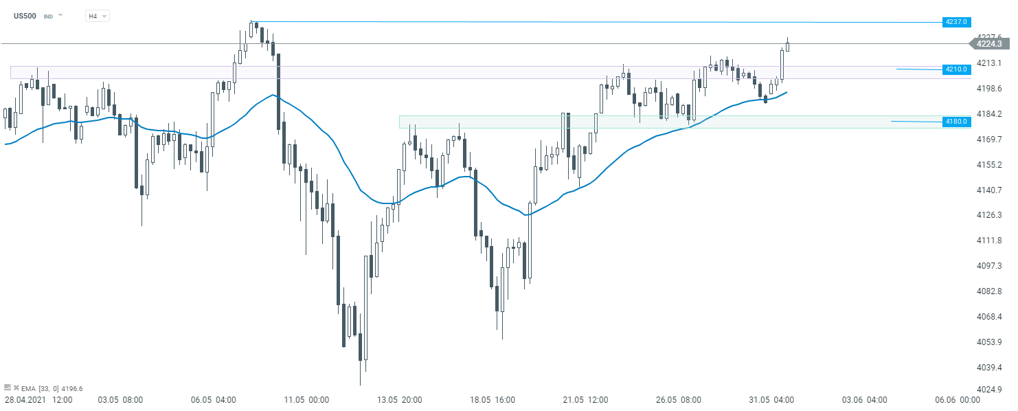 US500 has managed to break above key resistance area near 4,210 pts - a major threshold that bulls were not able to breach in recent days. As a result, the index climbed to highest levels since May 10. The path towards all-time highs is open and bulls might want to attack those levels soon. It is worth to notice that the sequence of higher highs and lows remains intact since mid-May, therefore the short-term trend remains upward. The mentioned 4,210 pts zone would be a major support in case of any declines. Source: xStation5